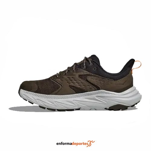 Zapatilla hombre HOKA ANACAPA 2 LOW GTX, confeccionada en su parte superior de piel nobuk impermeable con el sello Gold del Leather Working Group, con membrada GORE-TEX, transpirable e impermeable, con entresuela ligera de EVA, puntera de caucho resistente a la abrasión, empeine y paneles laterales de malla, con gancho superior metálico, plantilla, suela Vibram® Megagrip, talón SwallowTail™, forro del cuello y lengüeta de malla y cierre con cordones.
