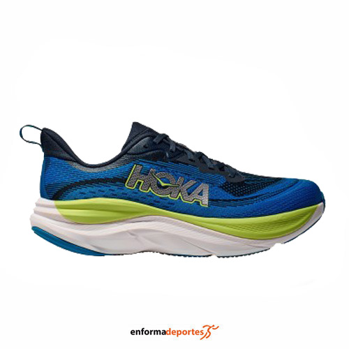Zapatilla hombre running HOKA SKYFLOW, fabricadas en su parte superior con empeine Creel de Jacquard, con cuello esbelto, lengüeta don doble refuerzo, combinan una excelente geometría inspirada en las Skyward X con compuestos de espuma mejorados, con nentresuela de SCF EVA supercrítica ofrece una pisada con una comodidad y rebote extraordinarios, mientras que la estructura Active Foot Frame™ centrada en el talón envuelve el pie; además, la suave geometría Meta-Rocker en el antepié resta esfuerzo, con suela muy duradera, resistente a la abrasión y cierre con cordones para un mayor ajuste.