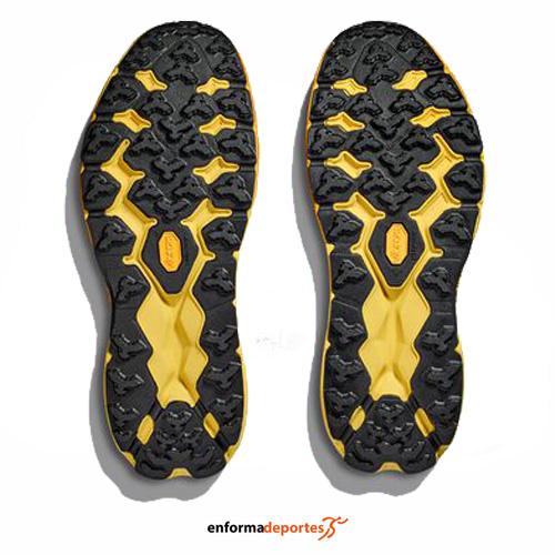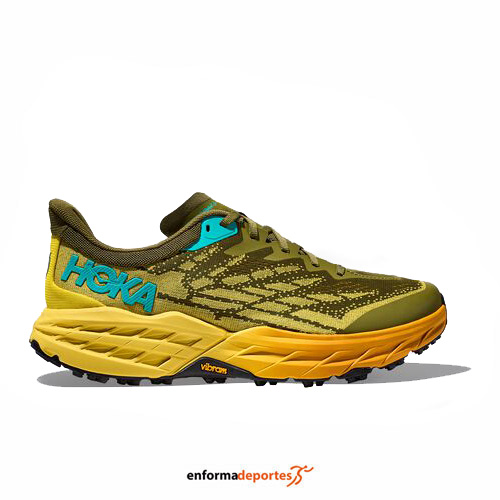 Zapatilla hombre HOKA SPEEDGOAT 5, confeccionada en su parte superior de tejido de malla mejorado que ofrece una gran transpirabilidad, con capas impresas en 3D que proporcionan apoyo y sujeción adicional en la zona del pie medio, con lengüeta reforzada con orificios estratégicamente ubicados que favorecen la transpiración, cierre con cordones con ojales con un refuerzo que proporciona un ajuste seguro, entresuela con una ligera espuma que mejora la capacidad de respuesta, suela con tecnología Vibram Megagrip que proporciona agarre y tracción en superficies mojadas o secas, con tacos de 5 mm.