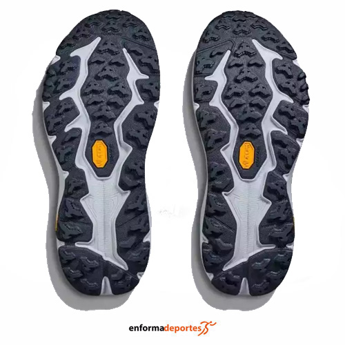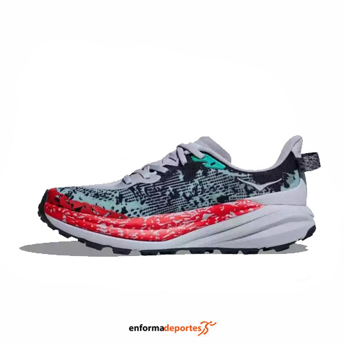 Zapatilla hombre HOKA SPEEDGOAT 6, fabricada en su parte superior de tejido ligero con refuerzos en puntera y lengüeta, con una pisada con capacidad de respuesta y adherencia para terrenos técnicos, con chasis con sujeción interna, entresuela ligera, con cierre con cordones para mayor sujeción y con suela Vibram® Megagrip con taco de tracción con tacos de 5mm para mayor sujeción en todo tipo de terrenos.