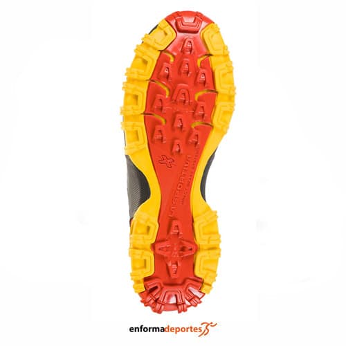 Zapatilla de trail-running, LA SPORTIVA BUSHIDO II, súper ligera, adherente, agresiva, obtener un ajuste más cómodo y una estabilidad global superior gracias al trabajo sinérgico entre la parte superior y la media suela, además de un aligeramiento del peso, evitando la inclusión de inserciones pesadas estabilizadoras en la parte central del calzado. El compuesto de suela bi-mezcla FriXion Red diferencia superficies de apoyo: la forma redondeada exterior se eleva lateralmente hasta tocar la suela intermedia, creando un ángulo de apoyo gradual para mantener la estabilidad sobre el terreno y te mantendrá firme incluso en casos de torsión extrema del pie. Esto te permite correr con seguridad incluso en terreno más técnico con presencia de raíces, piedras y ramas. Máximo apoyo envolvente en la parte medial del pie, libertad de movimiento y comodidad en la puntera.
