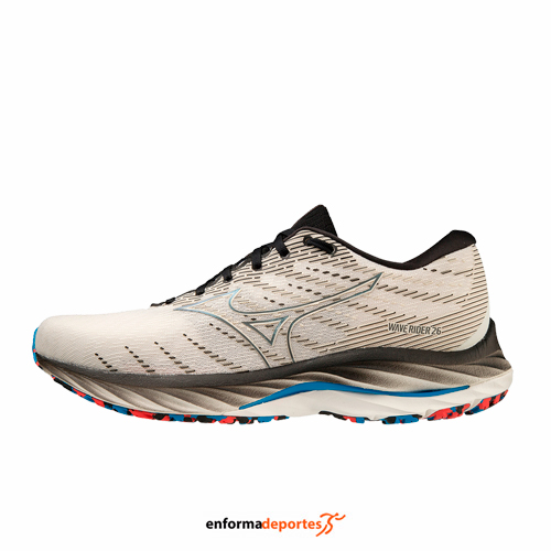 Zapatilla hombre MIZUNO WAVE RIDER 26, fabricada en su parte superior de AIRmesh que garantiza transpirabilidad y comodidad gracias a la tecnología DynamotionFit; con entresuela Mizuno Enerzy presenta 2 mm de grosor adicional para un máximo rebote y un potente retorno de energía, con placa Wave mejora la absorción de impactos para reducir la fatiga muscular y aumentar tu eficiencia. Y suela X10 es resistente a la abrasión para mayor durabilidad. Drop: 12mm.