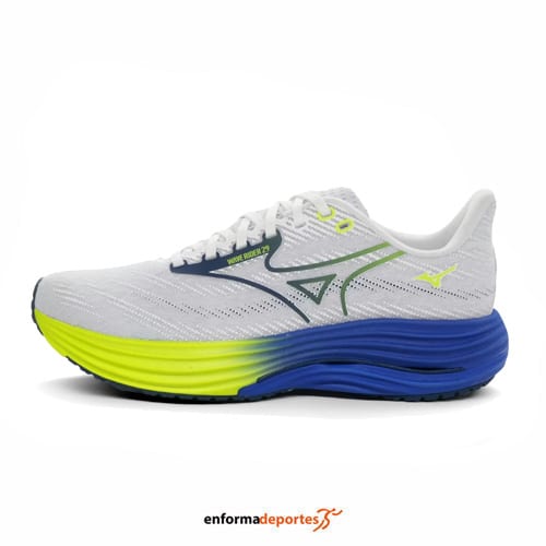 Zapatilla hombre MIZUNO WAVE RIDER 29, ideal para la práctica de running en asfalto, confeccionada en tejido y material reciclado, con mediasuela Enerzy NXT infusionada con nitrógeno, que ofrece una pisada más suave, reactiva y fluida, con grosor de mediasuela incrementado en +2 mm, placa Wave vegetal hecha con Elastollan® N (a base de biomasa) y drop 10mm.