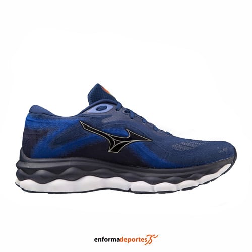 Zapatilla hombre MIZUNO WAVE SKY 7, confeccionada en su parte exterio en tejido knitted de punto elástico con orificios de transpiración y lengüeta gusset que se adapta al pie para una máxima comodidad, con orificios de transpiración, con altura de mediasuela de 8mm, suela ancha que proporciona mayor estabilidad y agujero central que favorece la amortiguación.