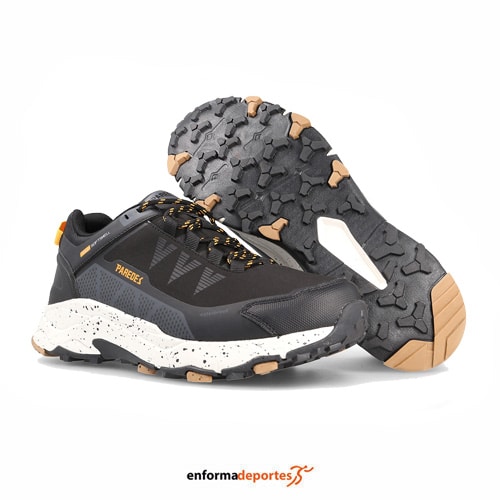 Zapatilla hombre PAREDES BOGAZ, fabricada en su parte exterior con tejido softshell, con refuerzos, que proporcionan mayor durabilidad, con plantilla Paeretex, cuello acolchado, cierre con cordones y suela con doble densidad, Phylon + TPR, ideal para la práctica de trekking.