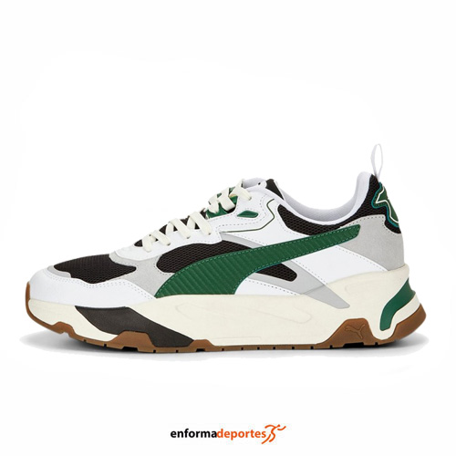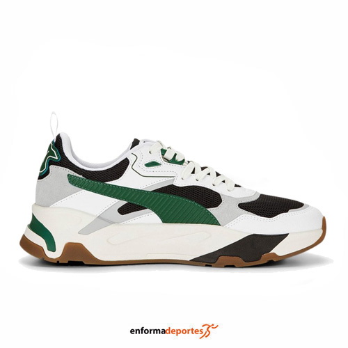 Zapatilla hombre PUMA TRINITY, confeccionada en su parte superior cuenta con una base de malla con superposiciones cosidas de cuero y material sintético para brindar una apariencia y una sensación de construcción, con entresuela que se eleva a través de sus detalles angulares y elementos pintados, lo que lo convierte en el héroe del diseño, con toda esta novedad a lo largo de la suela exterior de goma, con plantilla SoftFoam+ proporciona una amortiguación superior y una comodidad óptima para cada paso del día.