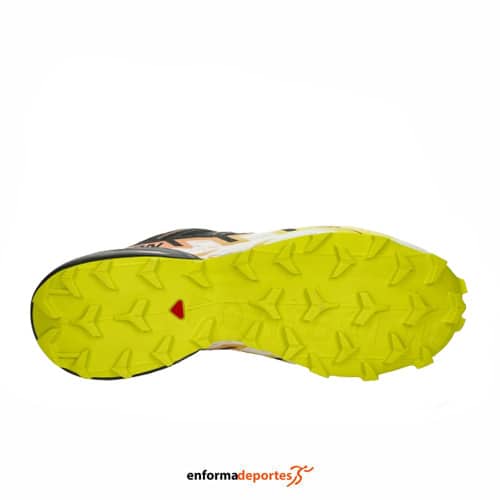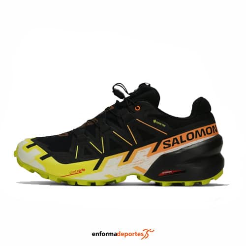 Zapatilla SALOMON SPEEDCROSS 6 GTX, con puntera y talón reforzados con tapones, con lengua ligeramente acolchada, suela interior extraíble, plantilla en espuma Ortholite más estabilidad y amortiguación, con cierre quicklace, sistema Sensifit que envuelve el pie en un ajuste preciso y seguro, con membrana GORE-TEX, impermeable y transpirable y con tecnología Energy Cell +, compuesto que favorece un importante retorno de energía oferciendo gran amortiguación y durabilidad.
