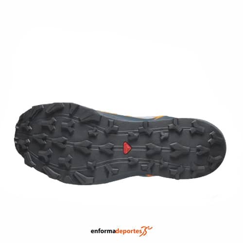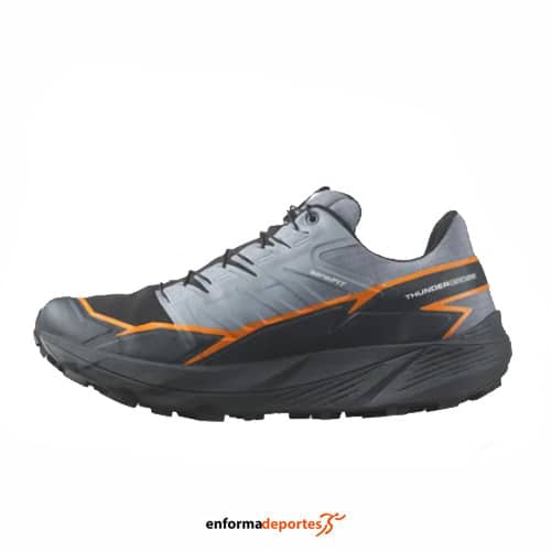 Zapatilla hombre SALOMON THUNDERCROSS GTX, confeccionada en tejido malla antipartículas con refuerzos en puntera, con tecnología Energy Foam, espuma ligera combinada con EVA, que ofrece amortiguación duradera, con plantilla ortholite garantiza máxima amortiguación, membrana Gore-Tex, que garantiza impermeabilidad y transpirabilidad, suela Contagrip All Terrain, con tacos de 5mm y sistema de lazada Quicklace.
