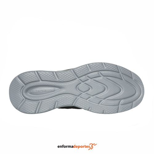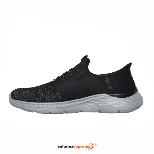 Zapatilla hombre SKECHERS GARNER, confeccionada en su parte superiro de malla y tejido sintético con cordones elásticos, con tecnología Skechers Hands Free Slip-ins® para un ajuste cómodo, Heel Pillow™ para el talón que mantiene el pie en su sitio de forma segura, con cómoda plantilla con amortiguación Skechers Air-Cooled Memory Foam®, plantilla con infusión de carbón vegetal ayuda a neutralizar los posibles olores, amortiguación Skechers Goga Mat Arch™.