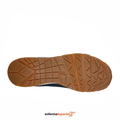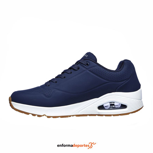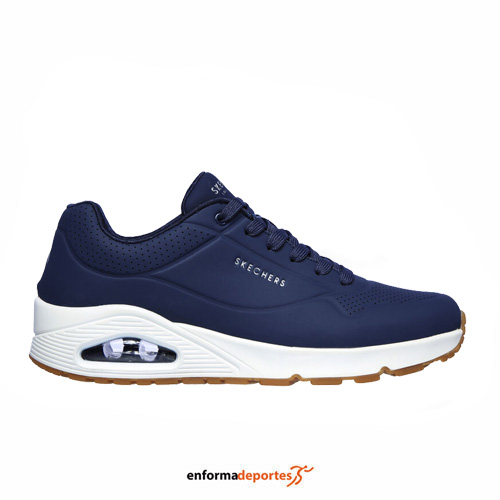 Zapatilla hombre SKECHERS UNO, confeccionadas en su parte superior sintética lisa y perforada, con cómoda plantilla con amortiguación SKECHERS Air Cooled Memory Foam®, con media suela con cámara de aire visible Skech-Air®, cierre con cordones y suela con tracción de goma flexible.