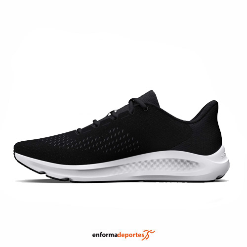 Zapatilla hombre UNDER ARMOUR CHARGED PURDUIT 3, confeccionada en su parte superior de malla de alto rendimiento ligera y transpirable, con acolchado de espuma alrededor del tobillo y bajo la lengüeta para un ajuste y una sensación increíblemente cómodos, plantilla de espuma Deluxe que se adapta al pie para una mayor comodidad bajo los pies, mediasuela Charged Cushioning® que utiliza espuma moldeada de compresión para ofrecer la máxima durabilidad y reactividad y suela exterior resistente para una mayor flexibilidad y tracción.