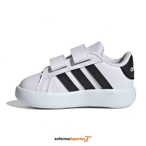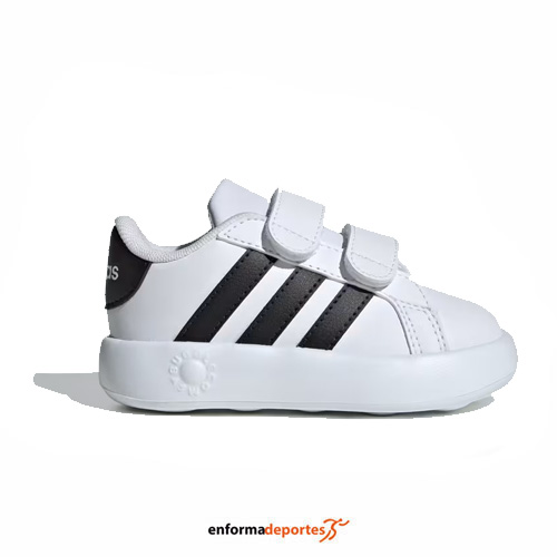 Zapatilla infantil ADIDAS GRAND COURT 2.0 Cf, confeccionada en su parte superior de piel sintética, de horma clásica, forro textil, cierre de velcro y suela de goma.