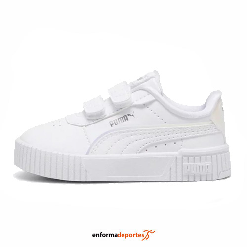 Zapatilla infantil PUMA CARINA 2.0 HOLO 2.0, fabricada en su parte exterior de material sintético, con horma estándar, cierre con 2 velcros, plantilla SOFTFOAM+ y suela de goma.