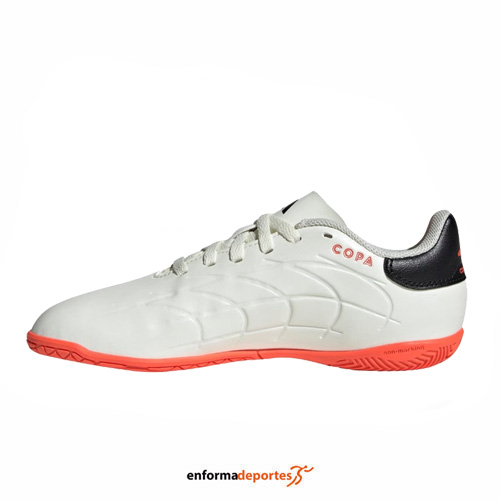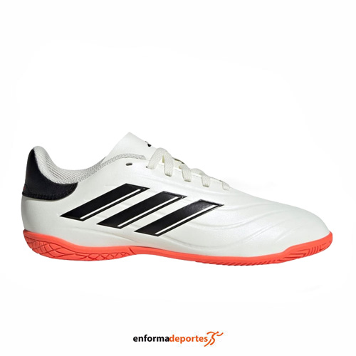 Zapatilla junior ADIDAS COPA PURE 2 CLUB IN, fabricadas en su parte superior en piel sintética de buen contacto y durabilidad, con detalles clásicos que le aportan un toque elegante. El collar acolchado con forro interior textil incrementa el confort, con suela realizada con goma de tracción y acabado «non marking», con diseño estable y puntos de giro, para pistas de interior y exterior poco abrasivas.