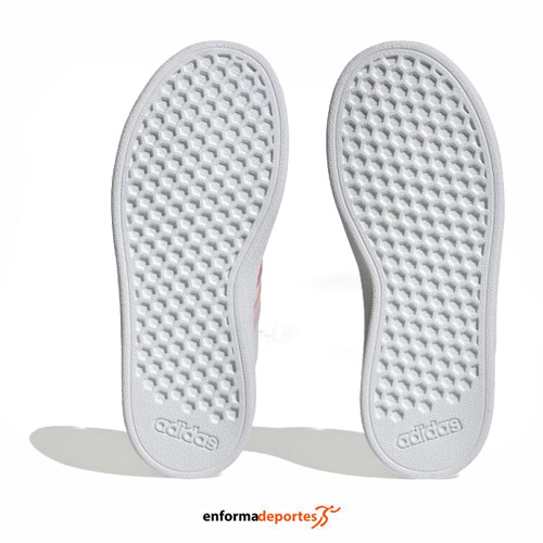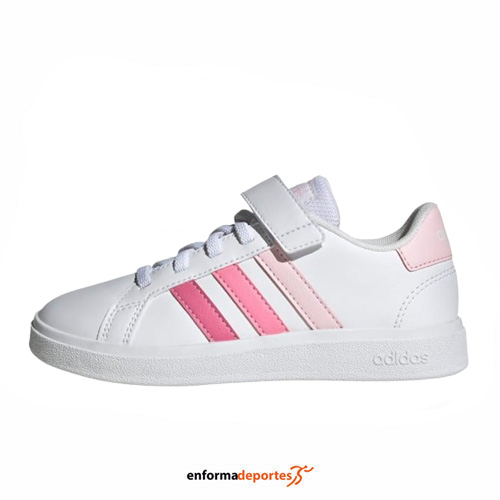 Zapatilla junior ADIDAS GRAND COURT 2.0 EL K, de horma clásica, confeccionada en su parte superior con piel sintética, forro sintético, cordones elásticos y cierre de velcro, con suela de goma para mayor durabilidad.