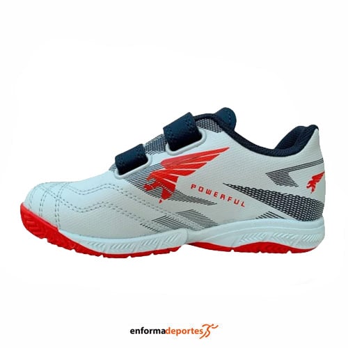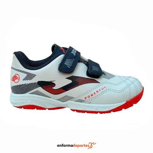 Zapatillas de fútbol sala junior JOMA POWERFUL 2505, fabricadas en su parte superior con material de piel sintética que garantiza durabilidad y un ajuste seguro, con plantilla acolchada garantiza una comodidad excepcional durante todo el juego, con suela de goma resistente está diseñada específicamente para el fútbol sala, ofreciendo agarre y tracción en cada movimiento y cierre de cordones permite un ajuste personalizado.