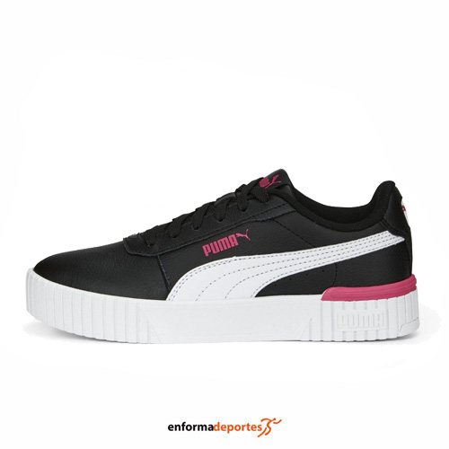 Zapatilla junior PUMA CARINA 2.0, confeccionada en su parte exterior de piel con componentes reciclados y empeine perforado, con plantilla SOFTFOAM+, entresuela de goma, cierre con cordones y suela de plataforma de goma con zona texturizada en la puntera y el talón.
