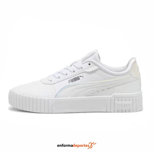 Zapatilla infantil PUMA CARINA 2.0 HOLO 2.0, fabricada en su parte exterior de material sintético, con horma estándar, cierre con cordones, plantilla SOFTFOAM+ y suela de goma.
