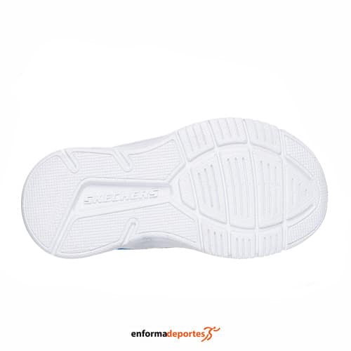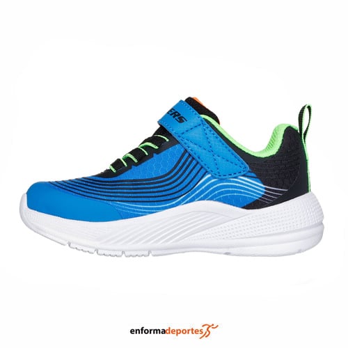 Zapatilla junior SKECHERS MICROSPEC ADVANCE, fabricada en su parte superior de malla con capa superpuesta y cordones elásticos, con cierre Adaptive Closure de Skechers para personalizar el ajuste y ponerlas o quitarlas fácilmente, cómoda plantilla con amortiguación y suela flexible con tracción.