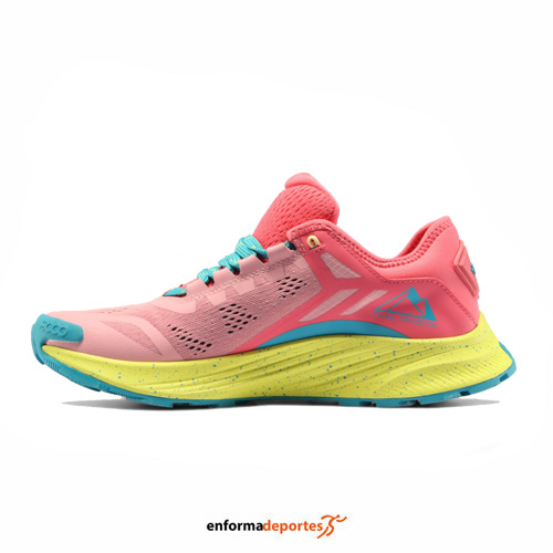 Zapatilla mujer +8000 TIGOR, ideal para trail running, fabricada en nylon y lycra con termosellados que evitan costuras, con forro interno mesh para mayor transpiración, construcción del talón y el empeine tipo «calcetín» ayuda al perfecto ajuste de la zapatilla, con suela, que proporciona una gran amortiguación y que gracias a su diseño taqueado, nos aporta una tracción y un agarre optimo.