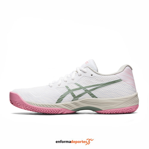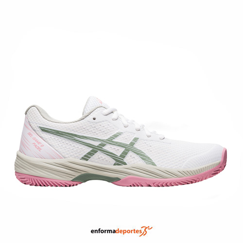 Zapatilla mujer ASICS GEL-GAME 9, confeccionado en su parte superior en malla suave que se adapta perfectamente al pie para una comodidad constante y una excelente resistencia, con entresuela Flytefoam EVA con inserto Hard EVA Twistruss que te permite disfrutar de una mezcla perfecta de estabilidad, reactividad y amortiguación, con inserciones laterales más resistentes, impresas en el lateral, con cuello acolchado que se envuelve mejor alrededor del tobillo, con lengüeta acolchada en malla y no integrada en la estructura, plantilla removible y suela con diseño Flex Groove que garantiza mayor flexibilidad y agarre en pistas de pádel.