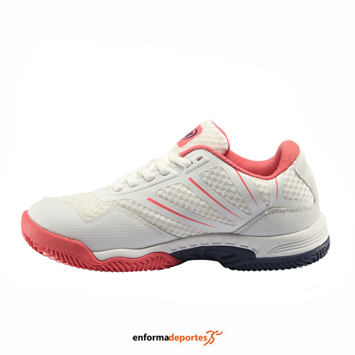 Zapatilla mujer BULLPADEL BEKER, diseñada y pensada para todos los jugadores de nivel y frecuencia media/alta que busquen un calzado flexible y transpirable, con protección en la puntera de goma de refuerzo inyectada y sin costuras, con alta resistencia a la abrasión, y por su forro interior de “mesh” textil, que aporta confort y mejora la transpirabilidad, con una suela perfecta para las pistas de pádel, fabricada en caucho de alta densidad con un dibujo en espiga de 3mm de profundidad, y cuyo diseño ayuda a sentir el máximo agarre y flexión del pie. Además, incorpora un estabilizador central fabricado en TPU, que mejora el equilibrio y refuerza la estructura central del arco del pie.