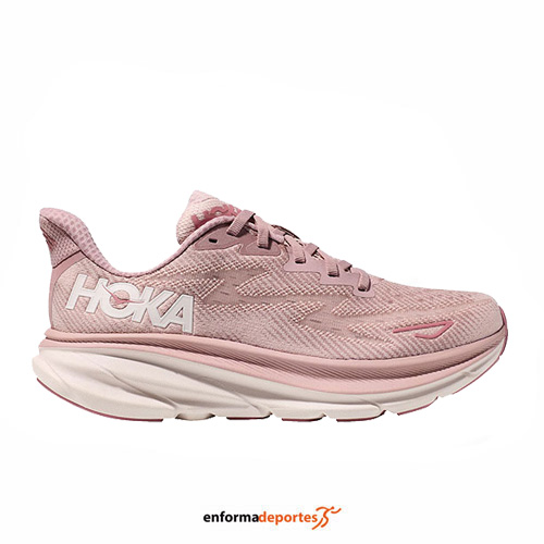 Zapatilla mujer HOKA CLIFTON 9, confeccionada en su parte superior de malla, meta-rocker en fase inicial, con empeine de punto técnico transpirable y nueva entresuela de espuma EVA moldeada por compresión, lengüeta reforzada, cierre con cordones de poliéster reciclado y suela exterior de caucho Durabrasion Rubber™ y drop 5mm.