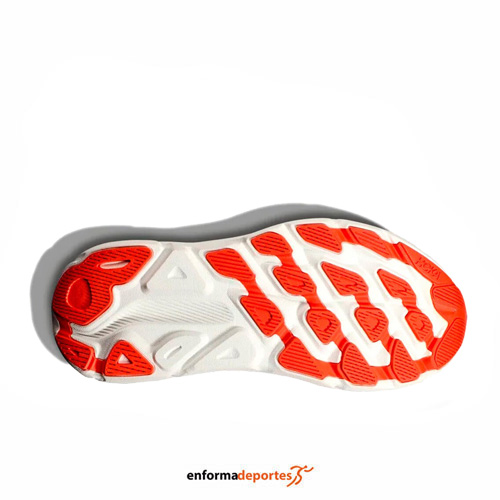 Zapatilla mujer HOKA CLIFTON 9, de pisada neutra, indicadas para medias y largas distancias, con empeine textil de punto técnico transpirable ofrece un ajuste ceñido y más adaptado al pie para unas sensaciones más agradables, con mediasuela para hacerla 3 mm. más alta, con diseño y silueta sin costuras que reduce las rozaduras y fricciones que pueden generar la aparición de ampollas, mediasuela Soft EVA extra suave y con un 30 % más amortiguación que la EVA tradicional. Su diseño Meta-Rocker en fase inicial, con efecto balancín, proporciona movimientos fluidos que incrementan el dinamismo de la carrera y suela de caucho Durabrasion Rubber™ colocado de forma estratégica para más tracción y durabilidad. El diseño Full Ground Contact ofrede flexibilidad y una suave transición talón-puntera.