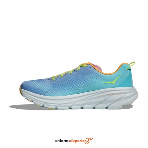 Zapatilla mujer HOKA RINCON 3, de pisada neutra,  con baja amortiguación, fabricada en su parte superior de empeine con una sola capa de malla que permite respirar al pie sin añadir peso adicional,  con entresuela de EVA con compresión completa, que proporciona la amortiguación exclusiva de HOKA, rediseño de Meta-Rocker de fase inicial que permite una aceleración aún más rápida, con suela con diseño de contacto total con el suelo y refuerzos de caucho con alta resistencia a la abrasión distribuidos estratégicamente para reducir el peso y drop de 5mm.