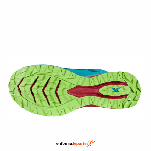 Zapatilla mujer LA SPORTIVA KARACAL, de ajuste cómodo y lengüeta tradicional, confeccionado en la parte superior sin costuras gracias al sistema 3D Mesh que permite la contención de volúmenes y una alta transpirabilidad, los refuerzos de microfibra refuerzan la estabilidad general de la zapatilla, ligera, flexible, con entre suela de EVA de doble densidad ligera y duradera, zona de la puntera preformada térmicamente contribuye a la ligereza y proporciona una excelente protección contra los impactos a rocas y raíces, suela esta compuesta de X-Frixion Azul en forma de bloques de espesores diferenciados. El Impact Brake System está diseñado para largas sesiones de entrenamiento.