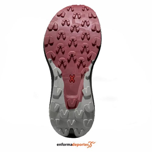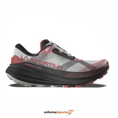 Zapatilla mujer LA SPORTIVA PRODIGIO MAX, fabricado en parte superior Comfort Wire con tejido Light TPU que proporcionan un ajuste firme y cómodo, incorporan la tecnología XFlow Endurance, que mejora la resistencia y durabilidad del material amortiguador, manteniendo la comodidad, máxima amortiguación y comodidad, alta protección y estabilidad en terrenos variables gracias a la suela con gran superficie de apoyo y rocker medio, combinada con una suela bi-compuesto Frixion Red que equilibra durabilidad en zonas de mayor desgaste y máximo agarre en la parte media delantera.