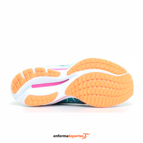 Zapatilla mujer MIZUNO WAVE RIDER 26, confeccionada en malla transpirable, con entresuela MIZUNO ENERZY es 2 mm más gruesa, lo que aumenta la amortiguación y el retorno de energía, brinda una sensación más suave y proporciona una propulsión similar a un resorte, con cierre con cordones para un mayor ajuste y suela que proporciona mayor tracción.