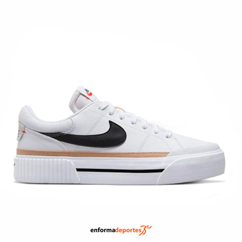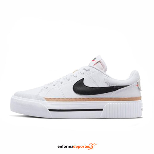Zapatilla mujer NIKE COURT LEGACY LIFT, confeccionada en su parte superior con material sintético, con mediasuela con plataforma para ofrecer un look con confianza, con suela exterior de goma para proporcionar tracción y durabilidad y talón acolchado y una lengüeta cómoda para una mayor suavidad.