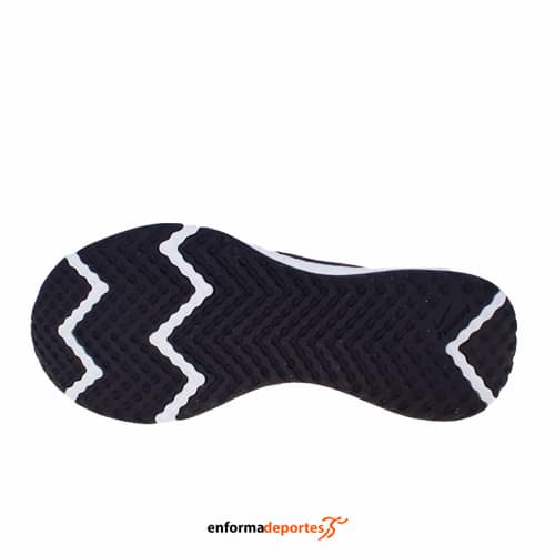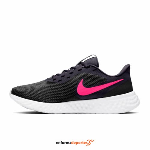 Zapatilla de running NIKE REVOLUTION 5, de mujer, confeccionada en la parte superior con un ligero knit con termosellados para evitar las costuras y sus posibles rozaduras, con refuerzos laterales para aumentar su durabilidad, con cuello acolchado mejorando el ajuste y dando un plus de comodidad, con lengüeta acolchada y transpirable y con mediasuela de Phylon amortigua la pisada y absorbe los impactos.