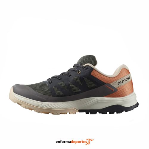 Zapatilla mujer SALOMON OUTRISE GTX, confeccionada en su parte exterior de malla con refuerzos para mayor transpirabilidad y durabilidad, con membrana GORE-TEX mantiene los pies secos, tanto por fuera como por dentro, con suela All Terrain Contagrip® está construido para la más amplia variedad de superficies, con espuma Fuze compuesta por uno de nuestros compuestos de EVA más suaves y diseñada con menos polímeros artificiales, Fuze Surge ofrece una zancada más dinámica, suave y consciente de la tierra.