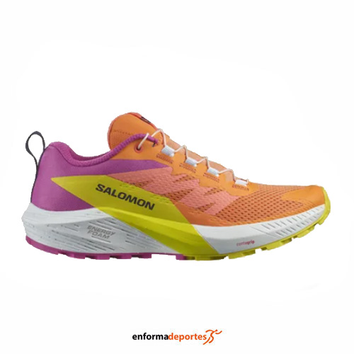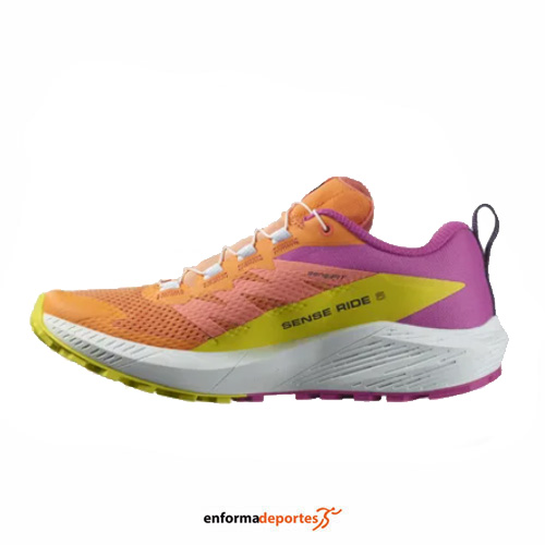 Zapatilla mujer SALOMON SENSE RIDE 5, confeccionada en su parte superior de malla 3D ligera, flexible y duradera proporciona un punto de apoyo optimizado y cómodo, All Terrain Contagrip®: Nuestro All Terrain Contagrip® está construido para la más amplia variedad de superficies, con tecnología SensiFit™ acuna el pie desde la entresuela hasta el sistema de cordones, proporcionando un ajuste seguro, ceñido y prácticamente personalizado alrededor del pie, garantiza durabilidad y confianza en superficies húmedas, secas, duras o sueltas, gracias a la espuma ligera y sensible creada mediante la combinación de EVA y olefina [OBC] para ofrecer una amortiguación duradera y un retorno de energía dinámico, con suela con tecnología All Terrain Contagrip® está diseñado para la más amplia variedad de superficies y entresuela Energy Save brinda el equilibrio perfecto entre amortiguación lujosa y respuesta adaptada.