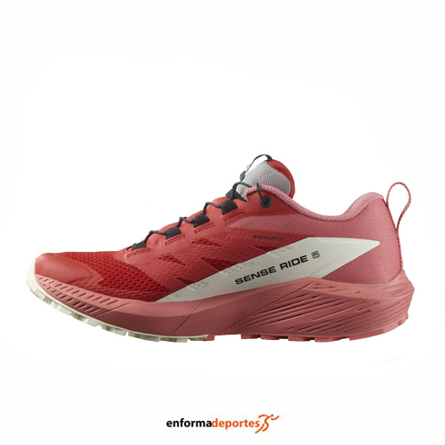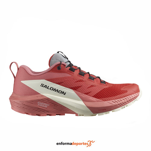 Zapatilla mujer SALOMON SENSE RIDE 5, confeccionada en su parte superior de malla 3D ligera, flexible y duradera proporciona un punto de apoyo optimizado y cómodo, All Terrain Contagrip®: Nuestro All Terrain Contagrip® está construido para la más amplia variedad de superficies, con tecnología SensiFit™ acuna el pie desde la entresuela hasta el sistema de cordones, proporcionando un ajuste seguro, ceñido y prácticamente personalizado alrededor del pie, garantiza durabilidad y confianza en superficies húmedas, secas, duras o sueltas, gracias a la espuma ligera y sensible creada mediante la combinación de EVA y olefina [OBC] para ofrecer una amortiguación duradera y un retorno de energía dinámico, con suela con tecnología All Terrain Contagrip® está diseñado para la más amplia variedad de superficies y entresuela Energy Save brinda el equilibrio perfecto entre amortiguación lujosa y respuesta adaptada.