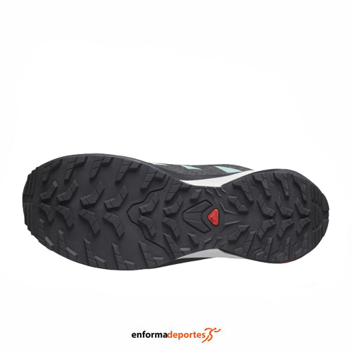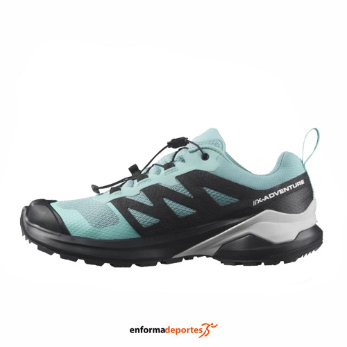Zapatillas mujer SALOMON X-ADVENTURE GTX, confeccionada en su parte superior de malla y refuerzos sintéticos en puntera, con membrana impermeable GORE-TEX y una suela All-Terrain Contagrip, con suela avanzada para soporte y estabilidad, ideal para afrontar terrenos inestables, advanved Chassis es una plantilla moldeada incrustada en la suela, con plantilla OrthoLite que proporciona una excelente amortiguación, transpirabilidad y durabilidad, mejorando la comodidad y el rendimiento del calzado y sistema de cordones Quicklace.