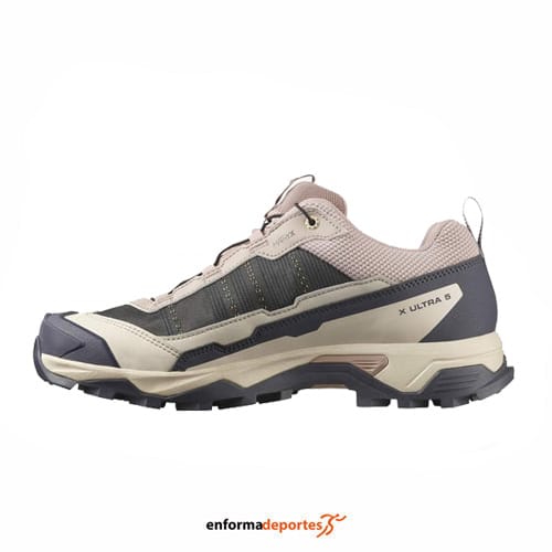 Zapatilla mujer SALOMON X ULTRA 5 GTX, fabricada en material superior Matryx®, tejido de alto rendiemiento y resistencia a la abrasión, fabricado con Kevlar® ligero y transpirable, con bolsillo para cordones Quicklace™, con tecnología SensiFit™, proporciona un mejor ajuste desde la entresuela hasta el sistema de cordones, con alas de soporte flexibles ayudan a estabilizar el pie mientras se mueve con la forma y el ancho del pie, con Entresuela EnergyCell, espuma EVA de alto rendimiento para una amortiguación óptima, con Advanced Chassis™ es un inserto moldeado incrustado en la suela exterior que proporciona un soporte lateral sólido y una protección segura al tiempo que optimiza la flexibilidad y la movilidad, forro textil de tejido suave y transpirable que proporciona confort, plantillas OrthoLite® se adaptan a la forma de su pie, proporcionando amortiguación superior, transpirabilidad y durabilidad y suela All Terrain Contagrip® está diseñada para un agarre óptimo en diversas superficies.