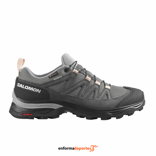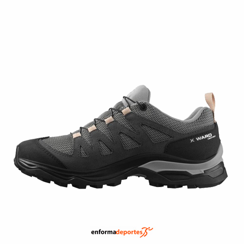 Zapatilla mujer SALOMON X WARD LEATHER GTX, confeccionada en su parte superior hecha de cuero de ante duradero y malla transpirable, con Membrana GORE-TEX® para una mejor impermeabilización y tener gran transpirabilidad, con cierre clásico de cordones, con empeine fabricado con tecnología SensiFit™, con entresuela EnergyCell™ , que amortigua la pisada, con suela Mud Contagrip® para un mejor agarre en superficies blandas, plantilla Ortholite® con propiedades antimicrobianas y con suela Advanced Chassis garantiza la estabilidad en terrenos difíciles.