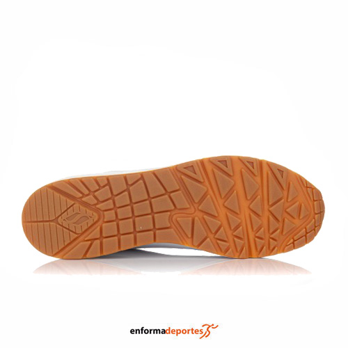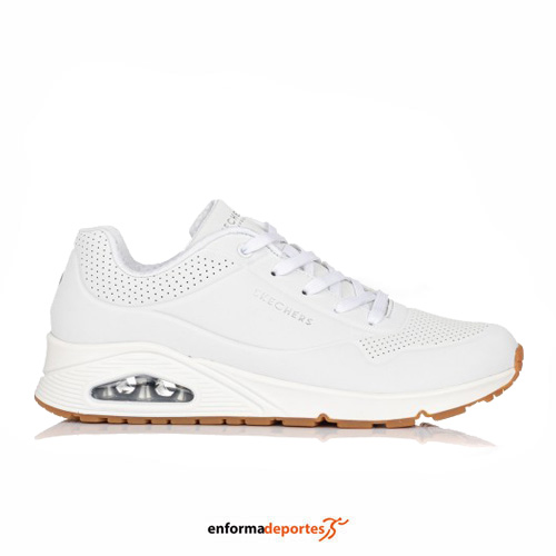 Zapatilla mujer SKECHERS UNO STAND ON AIR, confeccionada en la parte superior sintética con textura de piel, cierre con cordones y perforaciones en la zapatilla para mayor transpirabilidad, costuras de adorno, plantilla Air Cooled Memory Foam y media suela con cámara de aire visible.